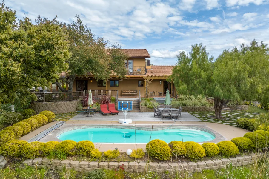 Escape to this country oasis and indulge in sunshine, poolside relaxation, hot tub soaks, yoga sessions, horseshoe or bocce ball games, horseback riding, hiking, or vineyard tending on this expansive 10-acre resort-style property. Situated just a brief 15-minute drive from Carmel Valley Village on a serene road opposite to Bernardus Winery, this home boasts an inviting open floor plan with a grand fireplace, an array of French Doors for seamless indoor-outdoor living, with one spacious bedroom on the main floor plus three additional bedrooms upstairs, plus a family room. Nestled atop a gentle knoll, this Tuscan-inspired residence offers sweeping views of the Ventana wilderness, along with the option to luxuriate in beautiful flower gardens or cultivate a flourishing vegetable garden. Whether seeking a weekend getaway for unwinding with loved ones or considering a permanent residence for a quieter lifestyle, this property, complete with air conditioning, promise both relaxation and sophistication.