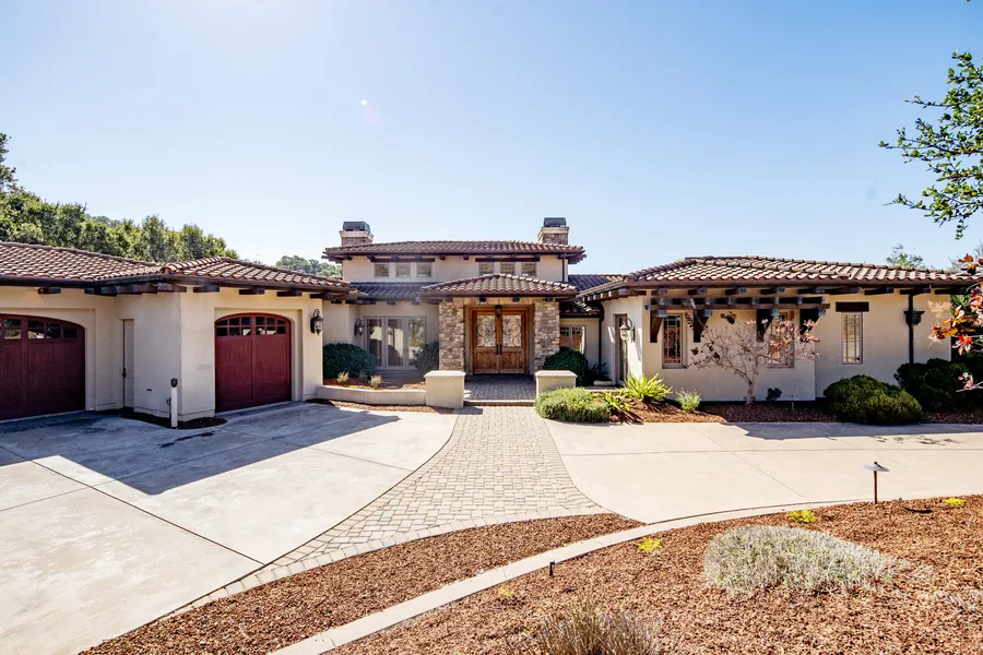 Soak in panoramic golf course and mountain views, from this grand Mediterranean home on the 5th Fairway of the Club at Pasadera. Situated on a private lot of just under an acre, the property features meandering pathways and expansive outdoor BBQ and entertainment areas, all centered around a beautiful pond and waterfall system. Inside, you'll find soaring ceilings and a massive fireplace, with French doors leading out to vista views. An entertainer's dream layout, the chef's kitchen offers an additional caterer's cooktop and prep area in the adjacent pantry. Entering the primary suite, you'll find an additional fireplace, 2 balconies, a walk-in closet and a spacious primary bath, with separate tub and shower. Immediately across the hall, the office/den area is adorned in custom wood work, and offers an ensuite full bath. Downstairs, your guests can enjoy a wood paneled bar and lounge are...