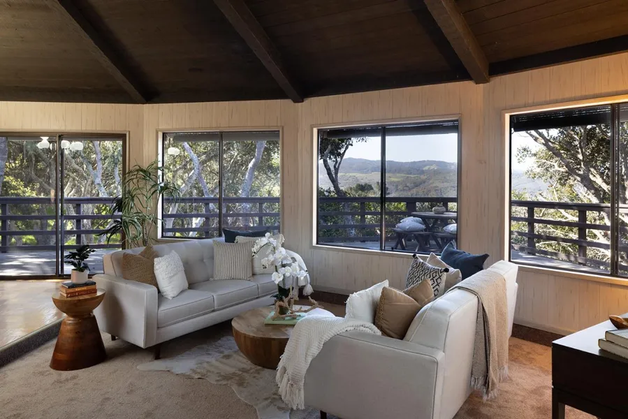 Conveniently located just up the hill from restaurants, shopping, and Folktale Winery, this amazing one-of-a-kind home sits in its own private forest. The ~1,800 sf, 3 bedroom, 2 bathroom house is perched perfectly in the oak canopy and enjoys views across Carmel Valley to the Santa Lucia mountains. Lovingly built in 1973, the 20-sided, circular house has an effortless flow from room to room. The stately stone fireplace provides a warming touch to the primary living areas and the expansive 360-degree deck makes for abundant outdoor living space that takes full advantage of the Carmel Valley sunshine and treetop views. This lovely home exudes character and tranquility and is just a short drive to all the wonderful amenities surrounding the Monterey Peninsula.
