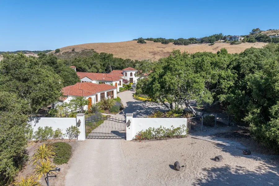 There's just no other way to say it - Pebble Beach quality in the Carmel Valley sun. Designed by local architect, Eric Miller, this custom built, Santa Barbara style villa, stands well apart from the crowd, and overlooks Carmel Valley and the Santa Lucias beyond. Private, gated, and single level, the decidedly pronounced estate feel and attention to quality craftsmanship can be felt throughout the home and grounds. Built in 1999, the structures, doors, windows, and general patina can seem as if they're still in their early years. Sited on 10 fabulously Oak studded acres, the main house of 2,779+/- Sq Ft offers a chef's kitchen with open concept living and dining, formal outdoor spaces and fountain, an office, and a primary suite luxurious enough for anyone. Inside the primary, you'll find french doors leading out to a patio, a separate sitting room, walk-in closet, gracious bath and a private hot tub access. For guests, the close-by, but separate guest house of 731+/- Sq Ft, offers 2 spacious beds and bath, as well as a living and kitchenette area. The property has the added benefit of being on a well. For those sun chasers looking for true quality in the Valley, you will be the favorite destination of all your "in town" friends.