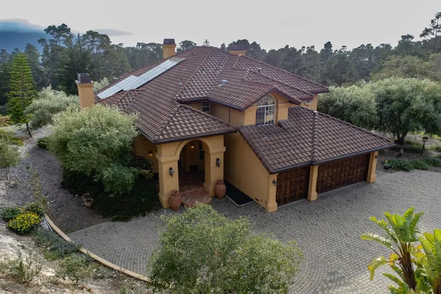 Nearly secluded within the prestigious enclave of Rancho Mar Monte, this custom-built Spanish Mediterranean estate offers exceptional privacy and timeless elegance just five minutes from downtown Carmel-by-the-Sea. Set on approximately 1.3 acres, the residence spans 4,631 square feet of refined open-concept living space, with sweeping valley views from most rooms. The home features five bedrooms and four bathrooms, showcasing Spanish tile and solid oak flooring, rich mahogany doors, and soaring ceilings that create an airy, inviting atmosphere. Bay windows and abundant natural light highlight the formal living and dining rooms, while multiple fireplaces add warmth and character throughout. The gourmet kitchen is designed for both everyday living and entertaining, equipped with high-end appliances, a butcher-block island, and a spacious chefs pantry. A formal dining room, breakfast nook, and breakfast bar provide versatile dining options. Cozy evenings await in the main living room or the separate family room, each centered around a fireplace. The expansive primary suite offers stunning valley views, its own fireplace, and a spa-inspired bathroom with jetted tub, separate stall shower, and an additional fireplace.