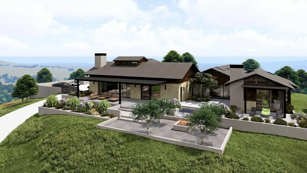 Sited on top of the knoll of a ~3-acre parcel of gently rolling hills and mature oak trees, this beautiful Monterra home site includes permitted plans for a stunning modern 5,004 SqFt main house, a 1,200 SqFt guest house, and a 1,200 SqFt garage/rec room, all with sweeping views of Monterey Bay and the surrounding Santa Lucia Mountains. Highlights of the design include a perfect blend of natural materials and modern features like walls of glass, an effortless flow between indoor/outdoor living spaces, a gourmet kitchen with a large island and wine fridge, luxurious primary suite, expansive patios and balconies to enjoy the breathtaking views, and manicured gardens with courtyards and water features. Avoid 2 years in the planning approval process and skip to the best partcreating your dream home. Included in the sale is a social membership to the prestigious Tehama Golf Club, granting access to a plethora of amenities including social gatherings, both fine and casual dining options, a fitness center, two pools, and tennis courts. Revel in the ideal climate of the Monterey Peninsula within this gated community, surrounded by nature's beauty yet just a short drive from golf courses, The Monterey Bay Aquarium, regional airport, acclaimed restaurants, hiking, and Carmel-by-the-Sea.