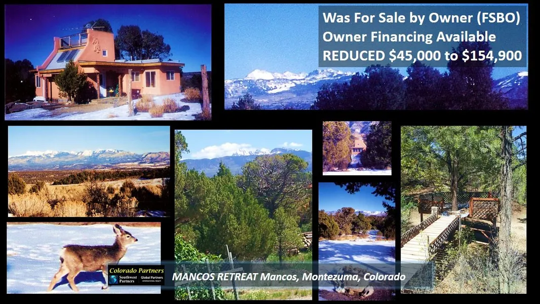 Reduced $45K. Was FOR SALE BY OWNER (FSBO)! OWNER FINANCING AVAILABLE. $154,900 US. 3% BBC.Just over tax value! 1 of best Colorado family ready deals. 3 wooded acres, super views. Surrounded by mountains & forests. 1,030 SF 1/1 loft home. 1/1 Bunkhouse. Gazebo. Community water. Low cost of living & taxes. Great quality of life. Just east of Mesa Verde National Park. 2.6 MI to Mancos, 9 MI to Cortez, 30 MI to Durango. Excellent schools (31 students/grade). Great neighborhood with: high home values, incomes & net worth; well educated; professionals, artists & families.