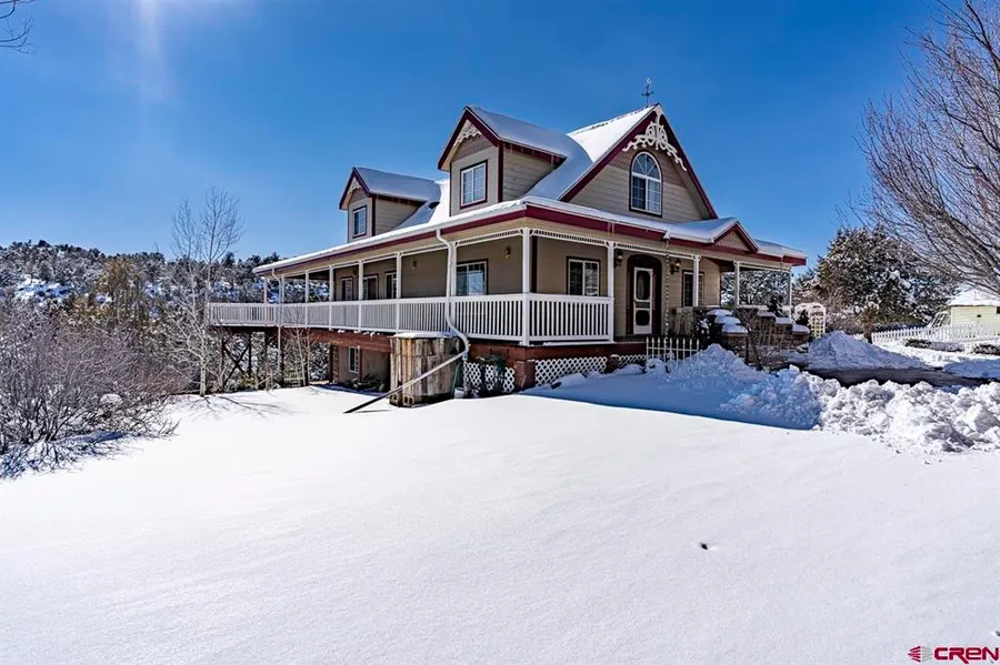 TRADITIONAL TWO-STORY FARMHOUSE ON 2.57 ACRES with 100% natural water runoff from Chicken Creek in the backyard! Soak your feet in the creek during summer months or drop a short line to fish for crawdads! You are steps away from private creek access! The main home is inviting with curb appeal and an expansive covered wraparound deck and views of the Menefee Mountains perfect for outdoor entertaining. As you walk into the main living room you are greeted with vaulted ceilings and lots of windows, allowing for natural sunlight and warmth. This home reveals many special touches and details by the builder that you dont want to miss! The kitchen has a built-in desk, built-in wine rack, a large island and pantry. There are two bedrooms on the main floor. The second floor is spacious, providing a loft, lots of storage, and the master bedroom and bathroom en suite. The master bedroom has a built-in window seat with storage, perfect for cozying up with your favorite book and a cup of tea! The master bathroom has double sinks and a built-in vanity. The lower level has been used as an in-law suite with two additional bedrooms, a full kitchen, and a large game room with vinyl wood floors, Aspen paneling, and custom crown molding, ideal for any outdoor enthusiast or those teenagers in your life! This property includes a separate Sawmill House with two bedrooms, a full kitchen, and fully fenced yard perfect for additional rental income! There is a 6-car insulated detached garage with pull-thru and plenty of room for storing those classic cars or a large RV or pontoon boat. Store your garden supplies in the eclectic Glass Bottle Storage Shed. The Red Shed with lean-to and sliding door is perfect for additional hobby farm storage or those chickens youve been wanting! Enjoy Colorado outdoor mountain living with this property and everything this lifestyle has to offer minutes away from Mesa Verde National Park, Jackson Lake, Summit Lake, and San Juan National Forest. Conveniently 25 minutes to downtown Durango.