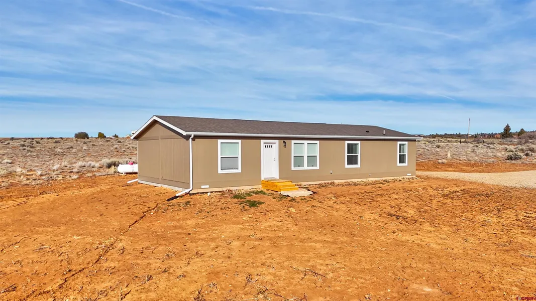 Ready for your new home in the country, while still being conveniently close to Cortez & Dolores? This 2023 manufactured home on a permanent foundation is situated on 3.35 acres in the scenic Dolores area. This 4-bedroom, 2-bath home offers a desirable split floor plan that provides privacy and functionality. The primary suite features a spacious bathroom with a step-in shower and a convenient sitting area, creating a comfortable space for everyday routines. The open-concept living room, kitchen, dining area, and family room offer a welcoming flow ideal for both daily living and entertaining. The kitchen is highlighted by a large work island, perfect for preparing meals while staying connected with the rest of the home. Step outside and enjoy breathtaking views of the surrounding mountain ranges, adding to the peaceful setting. The outdoor area is a blank slate... just waiting for you to put your touches on it. A storage shed is included, providing additional convenience. Plenty of space and stunning views make this property a must-see.