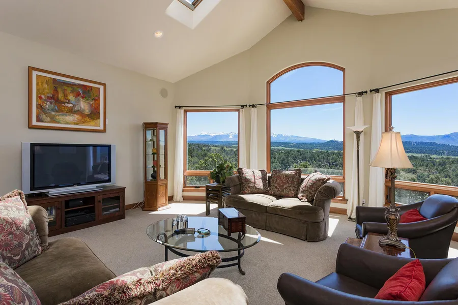 The home has two living areas that take in the stunning views with the option of a staircase or cherry wood lined elevator access. Fine finishes with contemporary style solid Cherry cabinetry, doors and trim, granite slab kitchen, and in-floor radiant heating. The lower level includes a living room with several windows, a fireplace and French doors which exit to covered patio spanning entire width of the house; 2 bedrooms and a full bath, office and large laundry room. Upstairs encompasses a large master suite with deck, dual custom walk-in closets off the main living room with fireplace, expansive mountain views from the large windows, dining area and gourmet kitchen, with a spacious walk in pantry. Built to La Plata Co building codes this custom house includes exterior synthetic stucco and 2x6 thick walls. Low E and double UV protection windows, wired speakers and central vacuum.