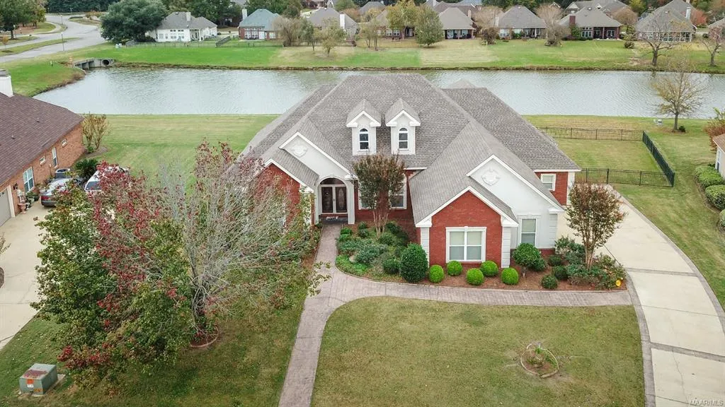 This fascinating Parade home sports an intriguing entrance adorned by four mosaic columns artistically complimented with beautiful expansive crown molding and elevated ceilings of approximately 12 feet. The open entryway leads to a spacious sitting room with vaulted ceiling at rear and an open formal dining room on the right. The enormous kitchen is a chefs delight, with its recessed lighting, abundance of mixed custom oak cabinets, drawers, open shelving, and glass front units, all highlighted with black-onyx granite countertops including a smooth cooktop island, chefs desk, bar seating, and chandelier-lit breakfast room. This all opens to the great room with gas log fireplace bordered with built-ins overlooking the waterfront. A sunroom also offers another panoramic water view. Ceiling in main bedroom features a framed, 8-sided cathedral-like centerpiece with triple-trey, recessed lighting border. Bath has step-up jetted tub, separate shower, separate vanities, roomy walk-in closet, a full-room-size closet, and a pocket-door water closet. Two of the remaining 3 bedrooms have Jack-&-Gill bathroom. Half bath, large laundry room with laundry sink and separate mud closet. 2-car garage with spacious storage room.
