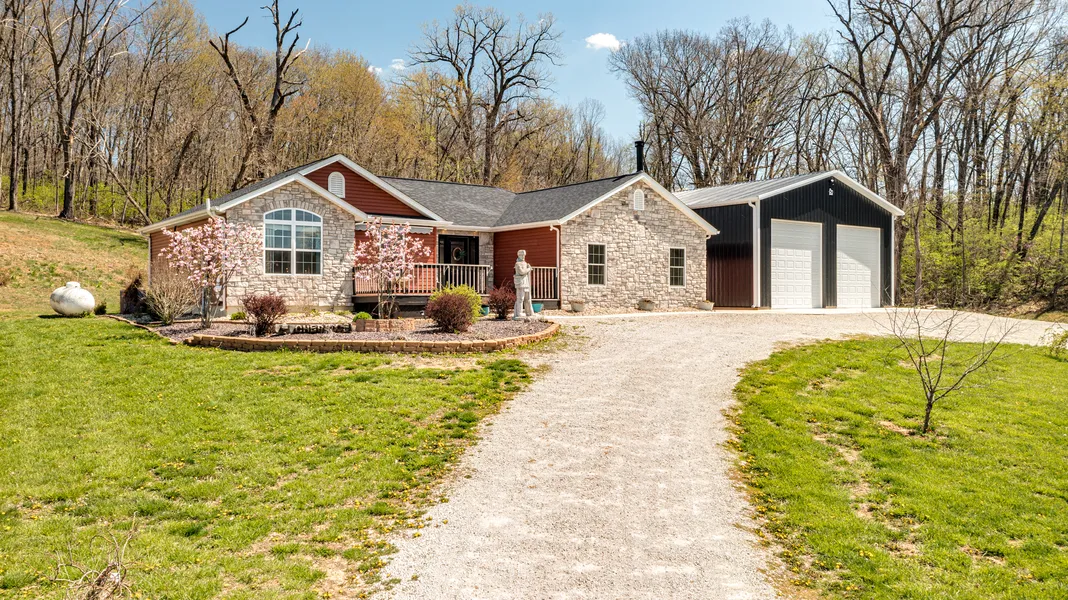 PRIVATE COUNTRY LIVING just minutes from town! This 4 bedroom, 3 bathroom 2016 home sits on almost 20 acres full of adventures that await the new owner! An avid outdoorsman's dream- with great hunting, a pond for fishing, timber, trails, a limestone creek, hills and elevation that lead to beautiful views, plus a shooting shack complete with power, solar lights and a woodstove. The property also features a 32x60 Pro Built Shed built in 2022 that has three doors with tall clearance. Inside the home you'll find an open concept kitchen and dining area, with lots of light and great views of the outside. The 22x22 living room addition features a woodburning stove, and room for any furniture arrangement. Primary bedroom boasts a large ensuite bathroom and a walk in closet. Basement has large bedrooms with egress windows and walk in closets, plus another full bathroom a large storage room. Back patio is set up for entertaining and wired for a hot tub. Don't read about it, come see about it!
