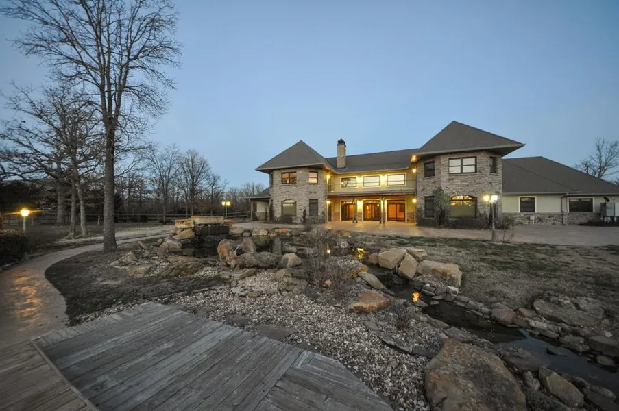 Executive Kansas retreat located in Montgomery County, KS along Onion Creek. Once you enter through the beautiful custom gated entry you travel the driveway 1/2 mile through a beautiful native meadow over an oak laced creek to your own personal 2.5 acre lake. Overlooking the lake is the luxurious custom 12,000 sq. ft. home/lodge strategically placed to enjoy gorgeous sunset views. The home was built to enjoy these views from multiple rooms throughout overlooking an elegant patio, park-like yard, and koi pond. No expense was spared in the construction which includes complete 14" insulated concrete, Rumford fireplace, commercial grade kitchen, custom cabinetry and iron work throughout, standard and spiral stair case, his and her garage, and so much more.