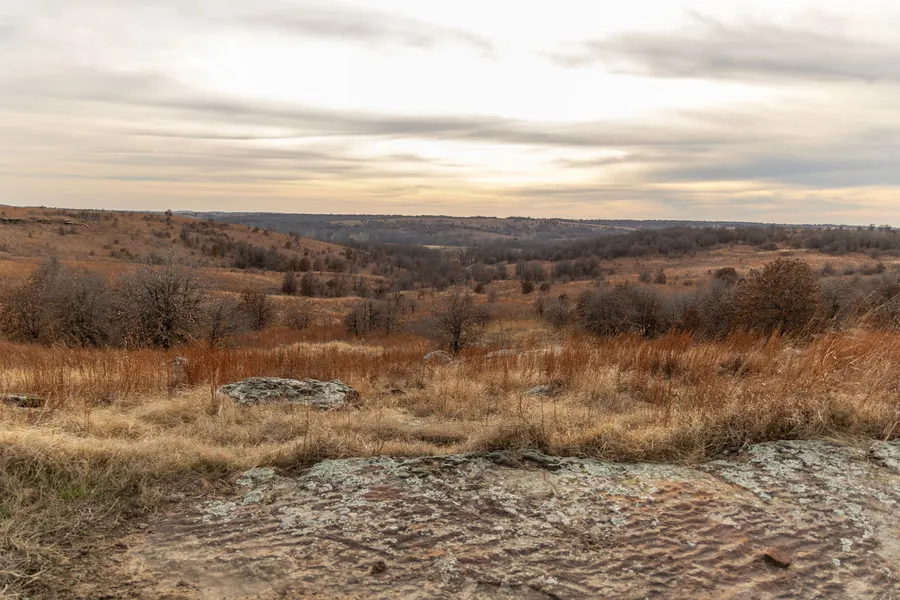 The ranch contains a mosaic of tallgrass prairie, cross timbers vegetation and riparian bottom land. From the peaks of the Chautauqua hills to the winding creek bottom, the topography on the property includes approximately 250ft of rugged elevation changes. Sandstone soils support native grasses, forbs, and legumes with a variety of upland woody species and hard mast producing bottomland timber. The mile of California Creek truly enhances the unique qualities of the ranch.