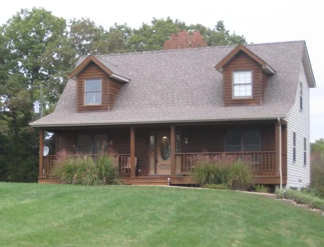 Close to Historic Hermann, MO! This home is situated on 6.46 manicured acres in beautiful Lone Tree Lake subdivision, which has a 22-acre stocked lake. The 3-bedroom, 2-bath home is approximately 1400 sqft. You'll be greeted by an extra large front porch with a rustic feel, as the front of the home has charming cedar plank siding. There is hardwood flooring in the entry & dining/kitchen combo, which has custom oak cabinets. Tongue-and-groove pine is on the vaulted ceiling over the living room and loft. The living room also has an electric fireplace with stone surround. Upstairs is the master bedroom with his & hers walk-in closets and a bathroom with a jet tub & separate shower. The possible fourth bedroom is a loft, which could be used as an office or den. An oversized two-car tuck under garage and tons of storage space is what you'll find in the lower level. Out back is a 10x10 deck a...