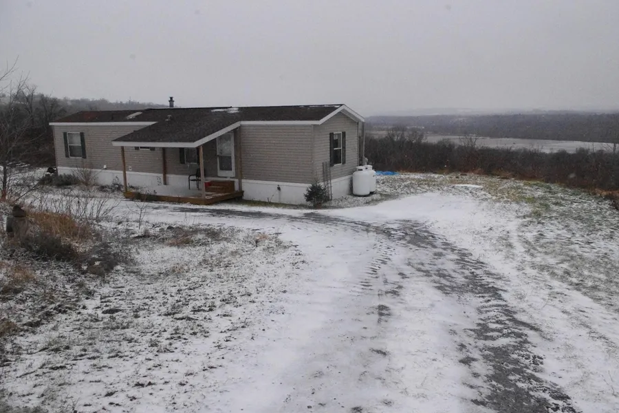 Single-wide home, open floor plan, 2 bedrooms, covered porch and back deck. Great views. Near the highway, but on lightly-traveled roads. This home cannot be seen from the roads.