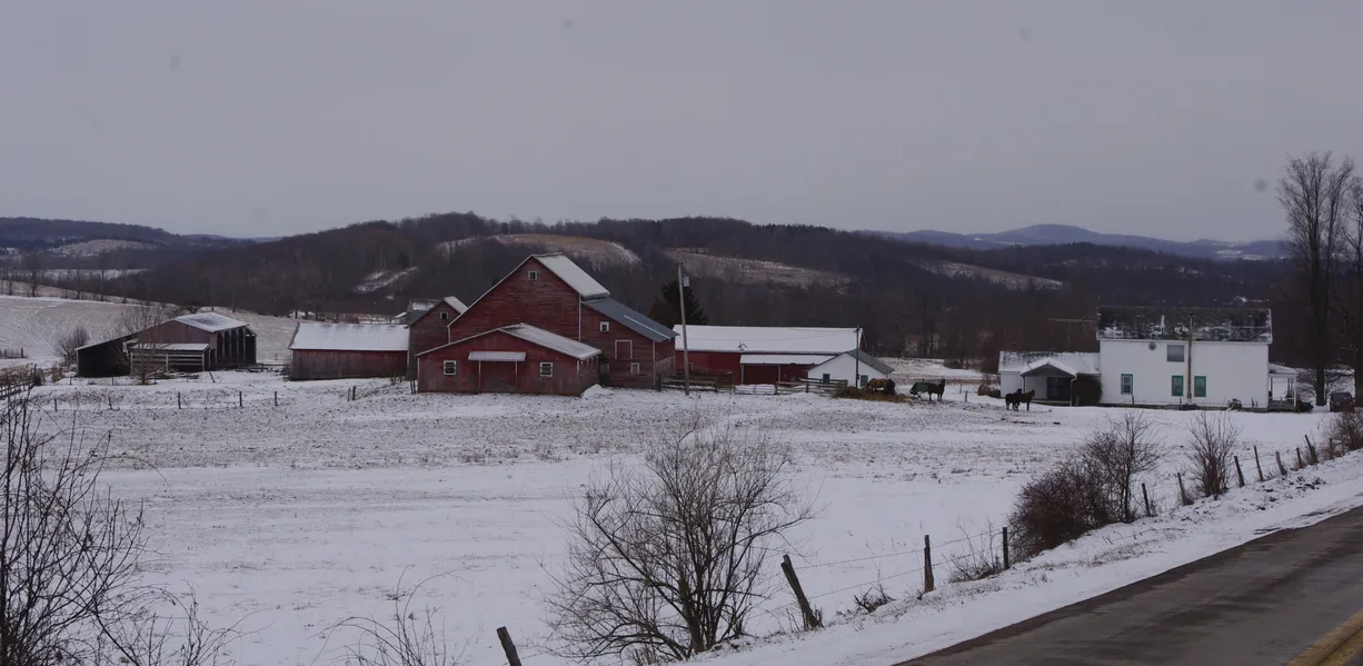 Currier & Ives setting, beautiful limestone land with 60 tillable (more could be), 18 more pasture. Wrap-around porch on the farm home. 3 bedrooms, 1.5 baths, 3 large downstairs rooms and one normal. Tons of barns (65x105', 60x60', 25x45', 50x95'....) in good shape. 4 box stalls and 12 straight horse stalls, cow stalls, machine storage, hay storage, workshop - you name it. Small line of machinery available too.