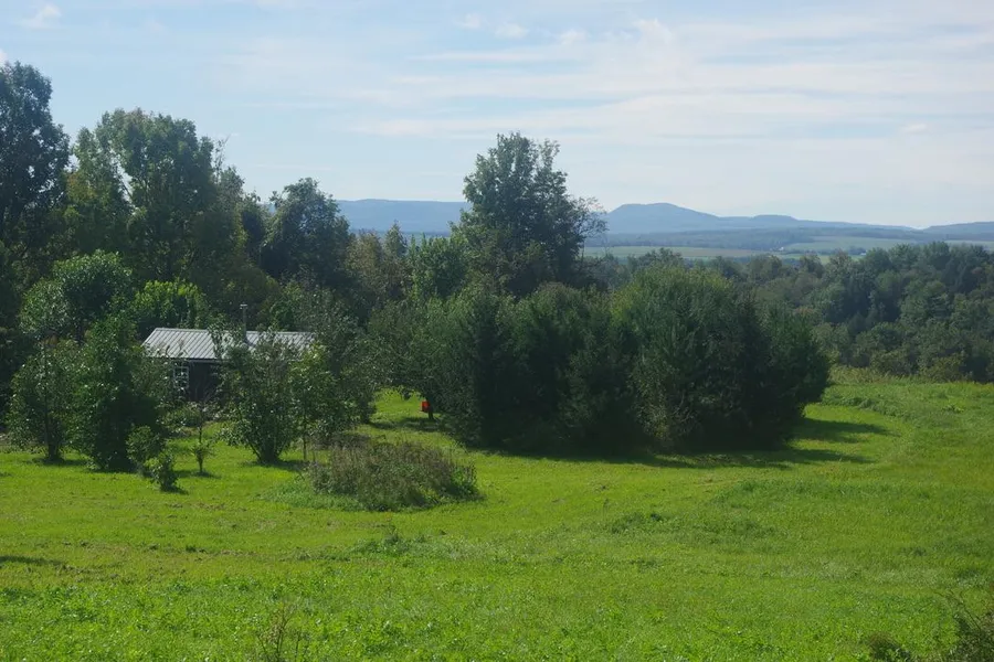 A rustic cabin measuring 12x24 has 2 sleeping lofted and has a wood stove for this snippy nights. A table, 2 chairs and a futon are included. It has a rainwater collecting system. If you needed more water, you could run a line from the drilled well over to it. The toilet is a clean composting one, located nearby.