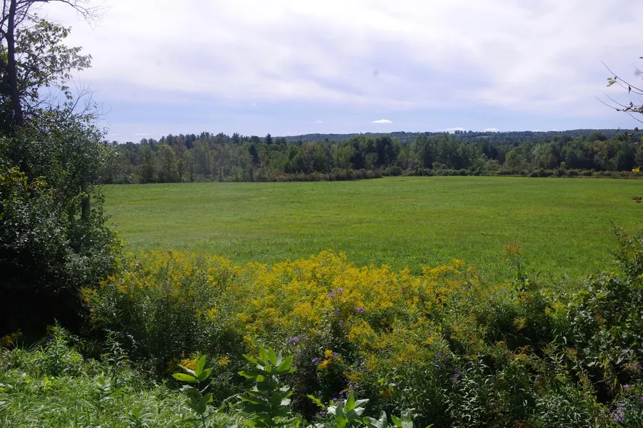 We have 194.56 acres, in two parcels, side by side. 35-40- are in grass hay and would probably qualify for organic. 50-60 more are in good woods and most of the remainder is in abandoned fields. there is fronrage on two roads, 1630 and 3227 feet. The property has some southern views and you can walk to a good restaurant or a convenience store - yet it is definitely country here. There are 2 traffic lights and no tolls between here and Albany. Youll find 2 small streams and a large shallow pond in the 30 acres of wetlands.