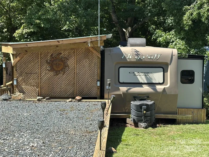This modern 2017 Camper offers a perfect blend of comfort and modern features, making it feel just like home. Step onto the covered deck(cover added 2021)- an inviting and cozy space ideal for relaxing or entertaining friends. Inside enjoy a spacious layout featuring a center island kitchen, two comfy loveseats (one reclining new 2024, one pull out sleeper 2022), a private bedroom and excellent storage throughout. (New rubber camper roof 2023) The backyard is a shaded haven, perfect for gathering around the fire pit on cool evenings. Additional storage for your lake gear can be found in the backyard 10X12 storage building. Whether you're seeking a weekend escape or a seasonal stay this might be the perfect spot. Located inside Badin Shores Resort you will enjoy many amenities such as 24 hour gated security at the entrance, putt putt, basketball/pickleball courts, swimming pool, sandy beach and lake swimming access, waterfront boardwalk over 1 mile long, boat ramp, clubhouse and more.