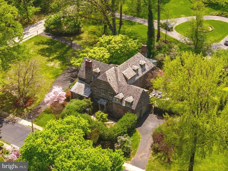 This classically designed and expertly constructed stone Tudor Revival masterpiece, built in 1928 by one of Philadelphia's most prestigious architects, Robert Rodes McGoodwin (also known for Chestnut Hill's 'French Village'), stands proudly today as a timeless treasure. Set on 1.05 acres in Elkins Park, on a beautiful tree filled block of Cedar Road, the home is surrounded by lush private gardens. This architectural gem features remarkable details and exceptional craftsmanship at a level rarely seen. The current owners have maintained and updated the home impeccably, with over three hundred thousand in recent improvements. As you approach the stately residence via a large circular driveway, you are welcomed through a hidden stone entrance into the impressive grand center hall. The entry, with its soaring staircase and arched doorways leading to formal living and dining rooms, includes a half bath and a deep coat closet. To the left of the entrance, a few steps lead down into a gracious living room, which boasts walnut floors, a high-beamed ceiling, French doors, and a beautiful stone fireplace. The sun porch off the living room, featuring a flagstone floor and leaded glass windows, offers French doors overlooking the gardens. The formal dining room, with its marble fireplace, is perfect for gatherings, while the sunny breakfast room connecting the dining room and kitchen provides a cheerful atmosphere. The modern kitchen is spacious and includes a new induction cooktop, dishwasher, and refrigerator, marble floors, a mosaic tile backsplash, granite countertops, double ovens and microwave. Adjacent to the kitchen is a large renovated laundry room, a door leading outside to a small intimate garden, and a staircase to the basement, which offers ample storage and an outside entrance. The elegant staircase to the second floor leads to a large primary suite featuring a fireplace, a huge walk-in closet and additional large bi-fold closet. The primary bath has radiant flooring, a double vanity, and a walk-in shower. There are three additional bedrooms with a connecting full bath, and a half bath on this floor. One of the three bedrooms is currently utilized as a large family room, while another serves as an art studio. There is also a charming space designated as a quiet reading room with built-in bookcases. The third floor includes two more bedrooms, large closets, and a bath. Atypical of a 1928 build, this home offers an abundance of closet storage throughout, including two huge cedar closets on the third floor and another large hall closet on the second floor. Additionally, there is a spacious heated studio in the rear of the home, currently used as a pottery studio with a kiln. The home is equipped with three zones of heating and two zones of central air. The private gardens are a delight to explore. Close to the home, a large flagstone terrace is spacious enough for a dining table and lounge area, allowing for the enjoyment of the spectacular gardens. This area overlooks a lovely private garden room, with winding paths inviting you to wander further into the yard. An Asian-influenced garden room off the kitchen features a beautiful Japanese maple. Further from the house, there is a large grassy area surrounded by perennial beds, providing a constantly changing array of colors throughout the seasons. A back lounge area overlooks a small bocce court. This sale includes two separate parcels, with the second deeded lot fronting onto Sterling Road. The home is conveniently located just minutes from everything, including the charming Elkins Park with its restaurants and shops, the SEPTA Elkins Park train station, Target, Trader Joe's, Whole Foods, shopping, additional restaurants, cafes, boutiques, schools, hospitals, parks, dog parks, trails, and golf courses. This location offers easy access to Wyncote, Jenkintown, Glenside, Abington, Huntingdon Valley, Mt. Airy, Chestnut Hill, Center City Philadelphia. Please watch beautiful Video