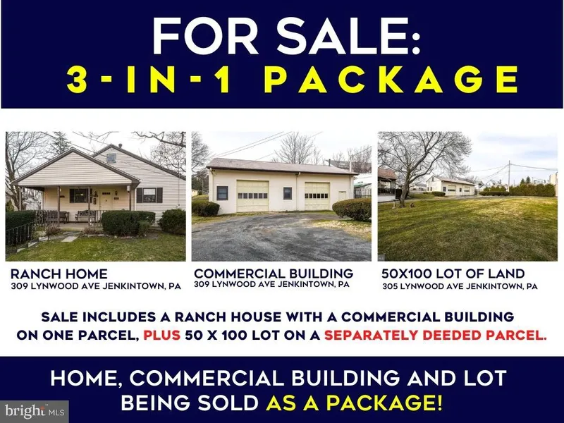 Great LIVE/WORK Space for: Contractor, Professional, Hobbyist, Car Collector, Crafts Person, Wood Worker and More. This unique 50 X 100 parcel is being sold in conjunction with a newer very well constructed ranch home and commercial garage. LOT 50 X 100 separtely deeded Tax Id 18-00-01736-001. House with Commercial Building together is Tax ID 18-0001738-008. This sale includes RANCH HOUSE WITH COMMERCIAL GARAGE/WORSHOP on one parcel PLUS 50 X 100 LOT on Separately Deeded Parcel. Hidden gem first time on the market. Newer very well contructed custom ranch home is being sold with a commercial building measuring 1500 sq ft. Home has two spacious bedrooms each with a full bath. Main living area offers a open floorplan with a large Kitchen with island, dishwasher, wood cabinets and double sink. Opens to a very large living area with sliding glass doors to a Balcony overlooking large private rear yard and wooded area. Conveniently located between the bedrooms is the laundry room including full size washer and dryer. Large Walk up attic, many spacious closets throughout the living area, and a full basement provide lots of storage. Basement with powder room could be easily converted to additional living space. Large two car garage with two overhead doors and man door. Other features of the house include commercial grade central vac system, 4 ceiling fans, pella windows and more. COMMERCIAL BUILDING with Finished Office and Powder Room, 1500 sq ft (30x50) concrete block construction, 2- 10 ft x 10 ft overhead doors, plus 1 man door, 11 ft plus to bottom of steel beam, 6 concrete floor with with wire tied 3/8 inch re bar every 12 inches, 240 volt 200 amp 3 phase electrical service to the building, R-30 insulated ceiling, pitched roof installed approx. 1999, gas forced air heat (central a/c easily added to shop area) separately metered gas, water and electricity. The commercial space has a tenant that is on a month to month agreement with owner. Conveniently located with easy access to suburban areas and city, commuter train to center city and bus service near by. Huntingdon Valley Shopping Center, Pennypack trail along with restaurants and shops all within walking distance.