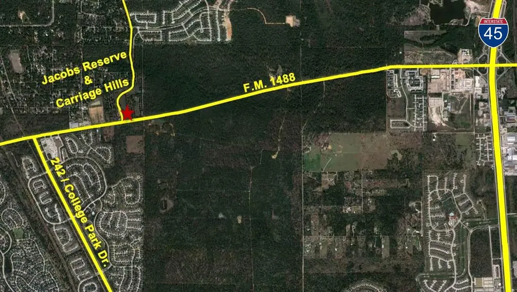 5 Acres on FM 1488 at Carriage Hills Blvd. Great location. Utilities Available Water, Sewer, Natural Gas, Electricity. Highly visible with 736 of frontage on F.M. 1488 and 264 on Carriage Hills Blvd. Perfect commercial location with traffic counts between 23,000 & 27,000. Only 2.5 miles from I-45. Hard Corner - Off Site Detention - All Utilities