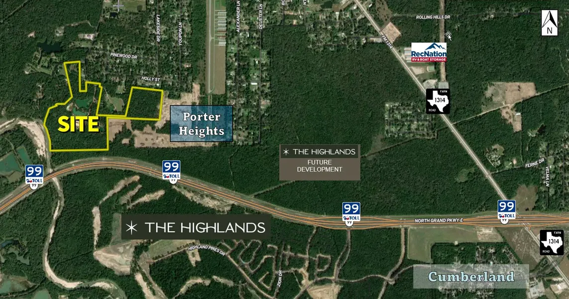Rare opportunity to own approximately 99 acres of land near Hwy 99 (Grand Pkwy) with multiple access points from Old Houston Rd & Bay Ln. This property boasts ponds, borders Porter Heights Subdivision, and fronts the W Fork of San Jacinto River, providing a picturesque setting for residential or commercial development. Situated in a high growth area between I-45 and I-69, this centrally located site offers easy access to FM 1314, Grand Pkwy (Hwy 99), and is just minutes away from Valley Ranch Town Center and Houston & IAH Bush Airport.