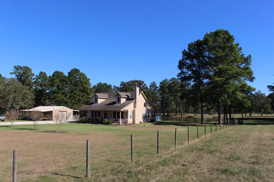 Gorgeous 3 Bed/2 Bath two story Traditional-Style home on 10 pristine acres located approximately 12 miles north of Historic Montgomery, Texas. Interior features include: Granite countertops, Country-Style Kitchen, tile and carpet flooring, large living area with wood-burning fireplace, dcor lighting, hickory cabinets and woodwork, large Master Suite with office/study, high ceilings and upgrades throughout. Exterior features includes: 24'x 40' barn with workshop and corrals, head gate and loading chute, perimeter fenced and cross-fenced, 1+ acre stock pond with bass and catfish, automatic iron gate entrance, grassy pastures, aerobic septic system, two large 8'x40' porches in front and rear with beautiful views of the property. Bring your livestock and/or horses. Pride of ownership is reflected throughout this lovely property.