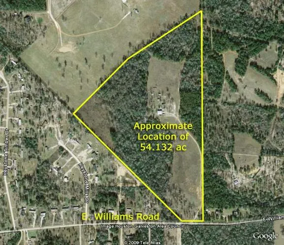54 unrestricted acres fronting on E. Williams Road just off FM 1484. About 60% wooded, mixed hard and soft wood. 1995 double wide, three bed, two bath, split plan, wood-burning fireplace, vaulted ceiling, island kitchen with breakfast room leading to 27x12 covered deck. 40x50 metal shop building on a slab for workshop, hobbies, or storage.