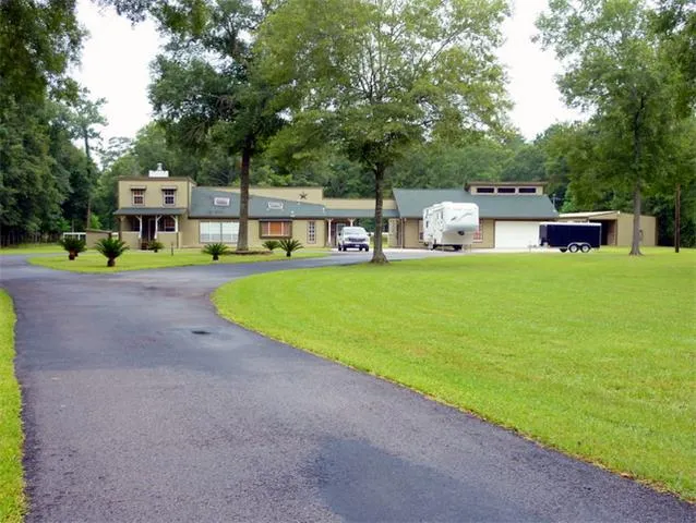 Enter property down a lane that leads to lovely ranch style home on 4.590 acres. Quality home with fine craftsmanship is comfortable and gracious. Country kitchen w/island. Windows and skylights galore; beautiful wood floors and new carpet + new paint compliment this immaculate home. Bring your horses - stable has 4 stalls and tack room. Oversized 3 car garage also has custom game room with bath that can be converted to office for small business. In country but close to I45 & I59.