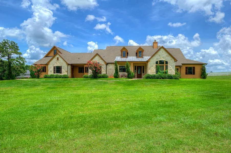 Fabulous Texas Ranch Style Home on almost 6 acres in the rolling hills of Perfection Ranch, minutes from Historic Montgomery & shopping. Soaring ceilings(10-16')&open plan. From kitchen you can see the family & dining room. Master suite has a large walk in shower with a soaker tub. Many built-ins and tons of extra storage throughout the home. Beautiful creek runs along front of property that leads into a 14 acre bass lake. Fish at your home! 4 stall barn w/tack rm & apartment incl in sq.ft.
