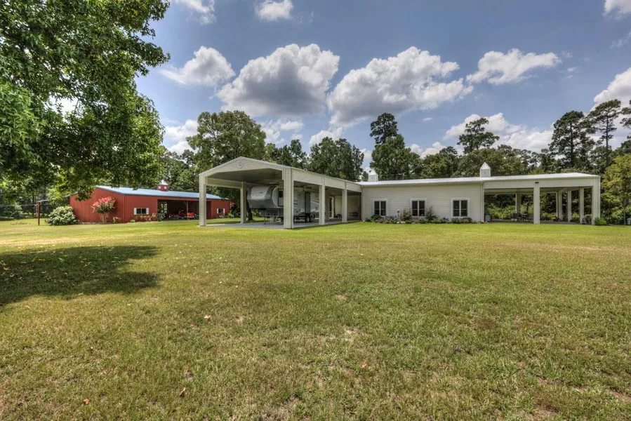 Just under 27 unrestricted acres in Montgomery with an eye-catching barndominium-style custom home, 80x36 barn/shop, water well, 2 septics for another home site, stocked pond w/pier + gazebo, improved pastures w/jiggs + bahia, dog run, attached carport w/RV parking + 3 car spaces, HUGE covered patio, current AG exemption in place. Interior boasts tongue & groove wood ceiling/walls throughout, soaring ceilings in living, dining & kitchen. Intriguing Master Suite. Secondary bedrooms w/loft areas!