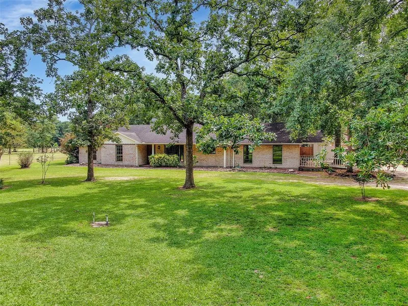 3/2 brick home, 2 barns, pens, paddocks, fenced/cross-fenced, 40 x 24 workshop on slab set back on 8 picture perfect acres with huge hardwoods, crepe myrtles, redbuds. Circular driveway. First barn is 80 x 60 with two lean-to type wings (tractor/equipment storage), 16' ceilings & drive through 12' doors on each end, 5 pens/paddocks, & storage/tack room. Second hay barn (36 x 24) w/several paddocks. 18 x 12 tack room w/wooden floor. Large barn has RV parking w/dump station. Water to all barns/buildings. Well (265' deep) & septic. Well built all brick home w/2 large living areas, huge utility room, formal dining & master with en-suite bath. Watch the wildlife from this beautiful back yard & patio. All improvements on 3 acres. Per seller, 5 acres can be subdivided into 1.6 acre buildable lots or use as pasture for amazing equestrian property, leisure ranch, farm. One entrance in and out, no through traffic. Ideal location with super low tax rate, no MUD tax. NO FLOODING!