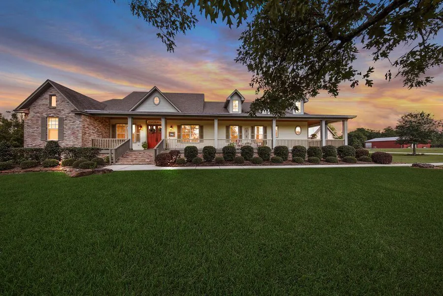 Charming farmhouse built by Terry Pickle. This stunning property has over 1800 SF of covered porches. A timeless custom home with trimmed windows, cased doorways and transoms. A true gourmet kitchen with 6 burner Kitchen Aid range, commercial grade refrigerator/freezer, porcelian farm sink, warming drawer/convection oven, prep sink and pot filler. Large walk in pantry with built ins. All bathroom are finished with built in drawers and plenty of cabinets for storage. Barn is fenced separate and is 50x50, has a chiller room for cattle or hunters. Can be easily converted into a car garage or workshop. This private residence is fenced and gated. Enjoy watching beautiful Texas sunsets on these porches!!