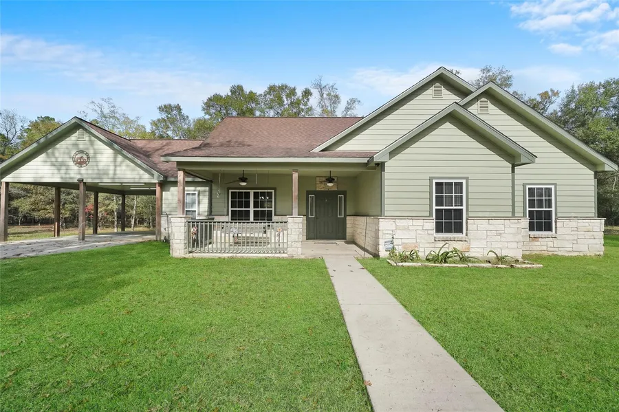 Your country-living dream is awakened as you enter the drive of this stunning 3 bedroom, 2.5 bath Craftsman-style custom home. Situated on nearly 5 fully fenced acres peppered with mature trees and gorgeous crepe myrtles, this move-in ready home features a 30x40 workshop and additional storage. Idyllic covered front porch with swing welcomes you. Dramatic stained concrete flooring and warm rustic finishes greet you as you enter. Designed for a life of ease, this home features a luxurious primary suite with deep soaking tub and separate walk-in shower with large walk-in closet and safe room. Home lays out spaciously with ample storage throughout and large closets in each room. Chefs kitchen features gas oven and range, granite counters with breakfast bar seating for four. Kitchen opens to large dining and living room making entertaining effortless. Enjoy the crackling of fresh timber as y...