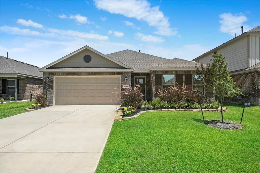 Shows like a new model. Barely lived in. This home comes with a refrigerator, washer, dryer, full sod, and a sprinkler system! Easy access to Hwy 59 and Hwy 45. Walking in to this lovely home, you will find solid surface flooring leading into an open floorplan that feels large and airy. The kitchen is the heart of the home with newly installed sweeping granite countertops, stainless steel appliances, a walk-in pantry, and a huge eat-in island that provides lots of workspace and additional seating. Along the back of the house are large windows that bring the outdoors in. The primary bedroom is tucked away for privacy. Stepping out to the covered patio, you will discover expansive greenspace for lots of play, beautiful landscaping, and a pool sized backyard. Other updates in this home include: full yard sprinkler system, customized shelving in the primary closet, and two beautiful custom f...