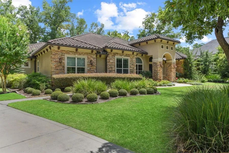 Welcome to 27331 Shady Hills Landing, a custom Mediterranean-inspired one story home with pool on breathtaking acre+ wooded lot. Open concept living is flexible enough for casual living or formal entertaining. The impressive entry is flanked by a well-appointed study and formal dining with groin ceiling. The kitchen, living room and breakfast room all flow to the patio, pool and impressive lot. You'll be wowed by the gas fireplace that opens to both the living room and patio. Savor cooking in the chef's kitchen with two islands and Thermador appliances including a 6-burner gas range with griddle and double ovens. Welcome the day with a view of the woods from the spacious primary suite. The split plan has 2 bedrooms on either side of the home. The long driveway provides lots of guest parking and leads to the 3-car garage with epoxy floor. Generac whole-house generator. Schedule your appointment to see this impressive home today and be on the way to making it your own.
