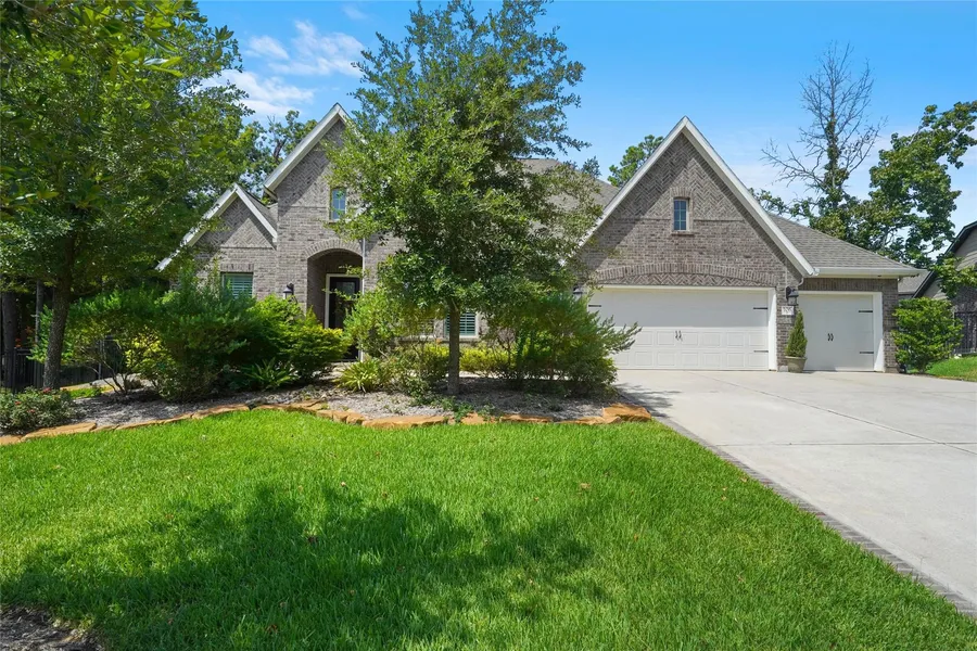 Tucked behind a forested esplanade, on nearly a half acre cul-de-sac lot, this exquisite One-Story overflows with beautiful selections with a design that lets you have it all on one level! Includes every gathering space you envision to add pleasure to entertaining and your daily routine. It offers both a Media with no windows for true-movie blackout experience with an adjoining Game Room, a beautiful Study with etched glass French doors and the most desired upgrade is the Large Covered Patio that has been extended beyond the plan. Grand scale main living spaces surround a dazzling Kitchen with gorgeous sea-glass back splash, giant gleaming island of quartz, double ovens with speed cook and dehydrate abilities plus a huge walk-in pantry. Beautiful continuous hardwood floors flow through the main living areas for a spacious feel that is enhanced by an abundance of tall windows that frame the private back sanctuary of lush bloomers and majestic greenery. The Family Room has double high ceilings, fireplace and the ultimate outdoor views. Showstopper Primary Bath offers a "car wash" effect with a walk through shower with no glass doors to clean, stand alone deep soaker tub, dual closets with organized built-ins and third row hanging. There are many upgrades that make this home special! It has 4 Garage bays with epoxy treated floors. Imagine the convenience for your cars, storage or a workshop. The home is Eco Smart and owners opted for the whole home paperless filter for added efficiency and improved air qualify. World Class Golf; Waterpark, Pools, Clubhouse, miles of walking Trails, Lakes, Dog Park. You will love the convenient location just minutes to The Woodlands, Lake Conroe and the Hwy 242 medical center.