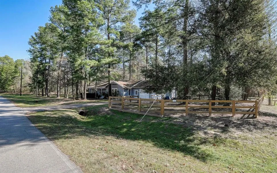 Welcome home to this beautiful country charmer in Clear Creek Forest where the deer roam free, right off your oversized welcoming front porch! This inviting, open floor plan is perfect for entertaining with an easy flow from kitchen to living & dining rooms. This 3 bed, 2.5 bath well kept home includes TWO flex spaces, currently used for home office and Tx sized closet. The kitchen is outfitted with granite countertops, custom tile backsplash, stainless steel appliances and a breakfast area right off the oversized pantry. Inside you will also find all hard floors, and a bright and fresh coat of paint throughout the entire home (Jan '24). The fully fenced back yard has plenty of room for all your furry friends, and the wooded lot provides shade for outdoor entertaining and grilling on your back deck. Clear Creek Forest offers residents a community pool, pavilion, parks, stocked fishing pond and NO MUD TAX! Nestled in a tranquil rural setting this home is an absolute MUST SEE!