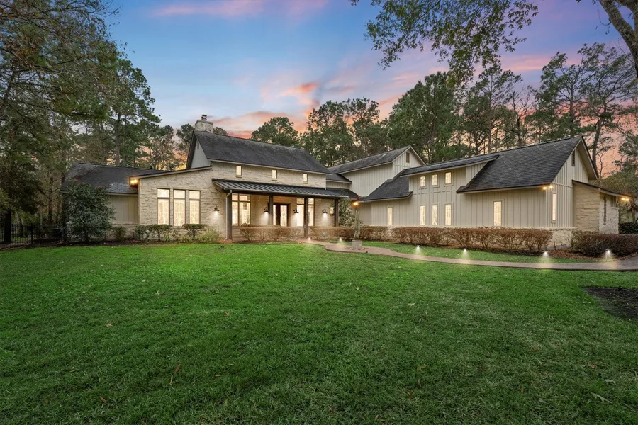 Exceptional, one-of-a-kind custom home on over an acre in the prestigious Benders Landing Estates. With approx. $150K in recent high-end updates, this stunning design features wood-beamed vaulted ceilings, gourmet kitchen with large marble island, quartz countertops, 2 Bosch dishwashers, wine cellar, commercial-grade appliances, & striking architectural details throughout. With 2 bedrooms & game/media room on main, plus 2 additional bedrooms up, this home offers the convenience of one-story living. Oversized 3 car garage opens to spacious utility room with fridge, sink, bench, & storage. The backyard oasis includes a generous Texas-sized covered patio, outdoor TV, fire pit, pool/spa, all set amidst nature's beauty. Additional features include whole-house generator, tankless water heaters, built-in speakers, and hidden room in primary closet, offering enhanced safety. Conveniently located in walking distance to community amenities & short drive to The Woodlands & International Airport.