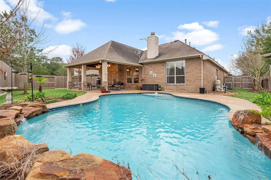 Charming Single-Story 4-Bedroom Home with Gorgeous Pool and Spacious Covered Patio! This beautifully upgraded home boasts a stunning brick & stone exterior. Inside, you'll find wood & tile flooring, tray ceilings, crown molding, + large windows. The open & airy floor plan is perfect for modern living. Chef's kitchen features a large island w/ SS appliances & 42" cabinets, while the breakfast area & family room offer lovely views of the beautiful backyard. The family room is anchored by a lovely corner fireplace, creating a cozy atmosphere. The spacious primary bedroom offers a relaxing retreat, complete w/a spa-like en-suite bath featuring a Jacuzzi tub and separate shower. Step outside to your PRIVATE oasis-sparkling pool with weeping wall water feature, great decking, & a large covered patio w/ wood accent ceiling. There's also plenty of yard space, ideal for play or pets. Located in a...