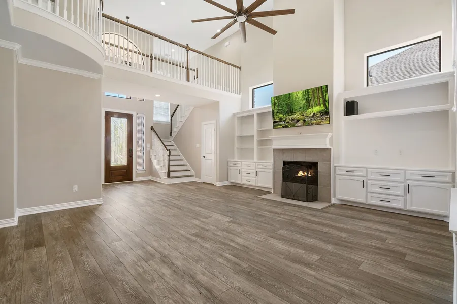 Welcome to this gorgeous home in a secured 24/7 manned gated community in Summerchase. This open floor plan home features high ceilings, natural light, crown molding, gas log fireplace, & custom built in nooks throughout. Prepare meals in the chef’s kitchen with quartz countertops, breakfast bar with pendant and recessed lighting, gas range, & eating area w/butler’s pantry. Relax in the large primary suite overlooking the private patio. The primary suite features a standing showing and jetted soaking tub with his and hers vanity. The walk-in his and her closets include custom built in dressers and locking gun cabinet. The upstairs bedrooms feature a large jack & jill bathroom with shower & toilet room. Upstairs space includes dry built in bar. Fully automatic sprinkler system. Yard has a French drain system. The home is freshly painted and the garage has sleek epoxy floors. This home als...
