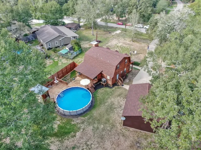 This spacious, unrestricted property on over 2 acres of land, offers endless possibilities! 4 bedrooms (including one downstairs that could be used as an office), 2.5 baths (plus extra 1/2 bath out by the pool), 1852 square feet, pool, and beautiful outdoor living space! Located in a serene and private corner of New Caney. Open floor plan with lots of natural light, 2024 new blinds throughout, covered porches front and back, a big detached garage with room to work, lots of parking space. Kitchen includes new dishwasher, granite counters, gas oven/cooktop (propane), pantry, tile floor, and lots of cabinets. New Roof - 2021. Original owner, meticulous maintenance! Landscaped front yard, open grounds with shade, areas for planting, and lots of storage. Furniture negotiable. NO MUD TAX! NO HOA! Horses allowed, low taxes, no MUD taxes, partially fenced.