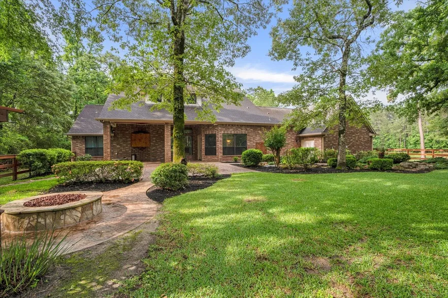 You won't find a more perfect setting for your family, custom 2-story home on nearly 3 acres, just 10 minutes from The Woodlands, Magnolia, Conroe, Lake Conroe, and close to Woodforest and 2 Step Farm. Enjoy peaceful country living with city convenience on this beautifully maintained 2.89 acres. This home features 3 beds, 2.5 baths, oversized 3-car garage with rear golf cart door, and a luxurious primary suite with stone fireplace and dual walk-in closets. Interior highlights include fresh paint, spacious living areas, study, game room, and a media room above the garage. The gourmet kitchen boasts custom cabinets, granite counters, stainless steel appliances, and walk-in pantry. Relax or entertain in the resort-style backyard with a covered patio, stamped concrete, built-in TV cabinet, and fire pit. The lot includes mature trees, lush landscaping, and a stocked lake with Fishing pier and fountain. A private retreat with high-end finishes and an unbeatable location!