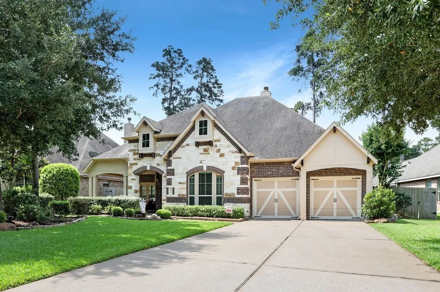 Discover a Rare One-Story Gem in Woodforest, this beautifully maintained 3–4 bedroom, 2-bath home, boasting upgrades throughout, offers a spacious open-concept layout that seamlessly connects the living, kitchen, and family areas. A standout feature is the large, light-filled office with French doors that open directly to the front patio, offering a tranquil workspace or the flexibility to use it as a 4th bedroom. The kitchen impresses with a generous island, abundant custom cabinetry, and updated Samsung appliances. The primary suite features a spa-like en suite bath with double sinks, a soaking tub, and a separate walk-in shower. Secondary bedrooms are generously sized with engineered wood flooring. Step outside to an extended covered patio and beautifully manicured backyard, perfect for morning coffee or evening gatherings. Conveniently located within walking or biking distance to local shops, dining, pools and parks, this home offers an unparalleled lifestyle. CONROE ISD SCHOOLS