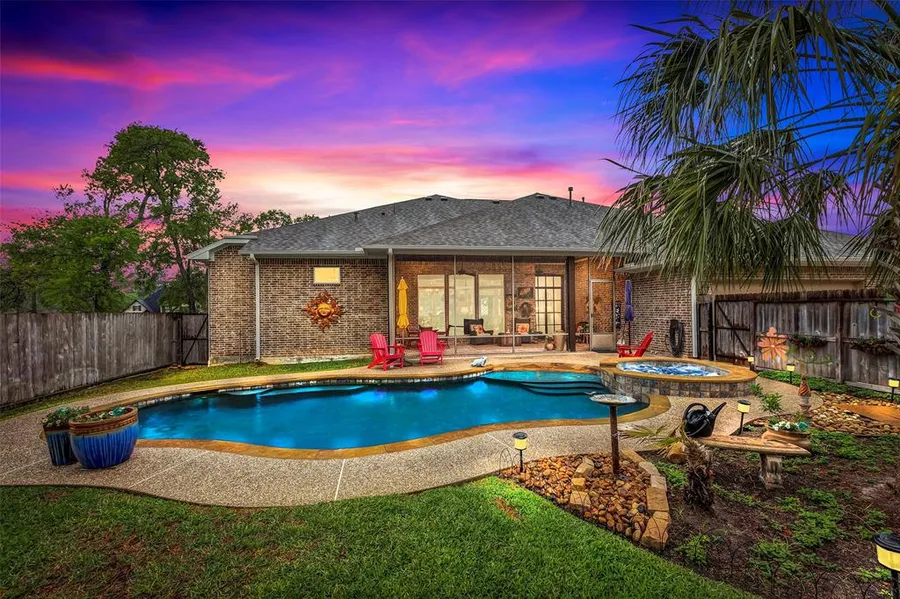Experience luxury living in this breathtaking Daigle Custom Home, perfectly situated on over 3/4 of an acre in the prestigious, gated community of Point Aquarius. Designed for elegance, this home features an open-concept split floor plan with expansive living and dining areas, soaring high ceilings with wood accents, and exquisite coffered molding. Step inside through custom metal doors to find top-of-the-line granite countertops, premium appliances, and a thoughtfully designed layout. The primary suite is a true retreat and private access to the front screened porch, perfect for enjoying peaceful mornings or relaxing evenings. Outdoor living is a dream with both front and back screened porches, one featuring a cozy fireplace-ideal for year-round enjoyment. The resort-style backyard showcases a sparkling pool and a putting green, creating a private retreat for relaxation and entertainment. Don't miss this rare opportunity to own a one-of-a-kind luxury home in Point Aquarius!