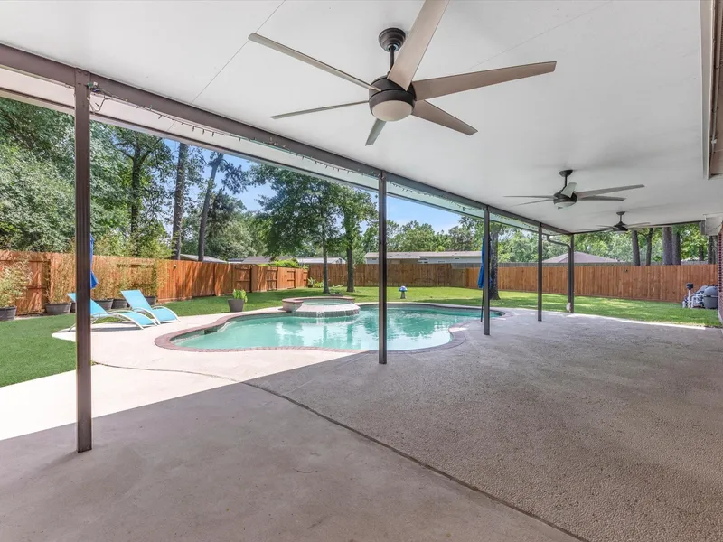 Gorgeous home in golf course community! Oversized lot w/ pool! Enjoy large covered back patio & pool with plenty of yard for gardening, playing, pets... Covered patio is insulated to keep you cool! Pool/spa is refreshing and welcoming to beat the heat just in time for summer! Beautiful home has primary down with an open plan. Kitchen & family room are open with high ceilings, fireplace & large windows for beautiful views of pool & yard. Plenty of room in the kitchen for meal prep & great for entertaining. Dining room is perfect for use as a home office since it's set to the front of the home. All luxury laminate floors downstairs are easy to keep and so pretty! Primary suite is large with beautiful ensuite and HUGE walk in closet. Gameroom upstairs plus secondary bedrooms & two more full baths. All with large closets, ceiling fans & 2" blinds. ROOF 2022, (2) HIGH END AC'S w/ DUCTWORK 2023, PLUS INSULATION, TANKLESS WATER HEATER 2024, FENCE 2020, GUTTERS ALL AROUND & FRENCH DRAINS!