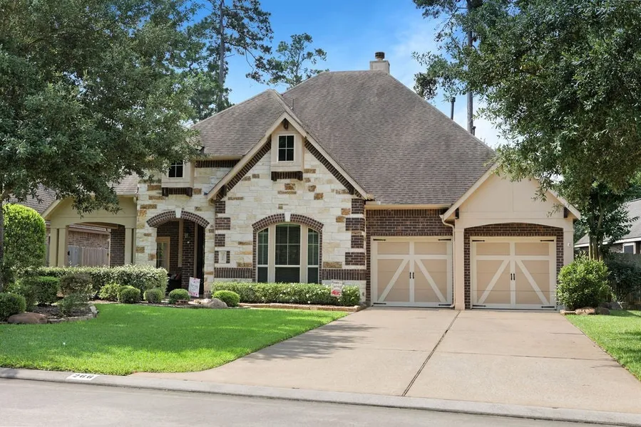 Discover a Rare One-Story Gem in Woodforest, this beautifully maintained 4 bedroom, 2-bath home, boasting upgrades throughout, offers a spacious open-concept layout that seamlessly connects the living, kitchen, and family areas. A standout feature is the large, light-filled front bedroom with French doors that open directly to the front patio, offering the flexibility to use it as a home office/study. The kitchen impresses with a generous island, abundant custom cabinetry, and updated Samsung appliances. The primary suite features a spa-like en suite bath with double sinks, a soaking tub, and a separate walk-in shower. Secondary bedrooms are generously sized with engineered wood flooring. Step outside to an extended covered patio and beautifully manicured backyard, perfect for morning coffee or evening gatherings. Conveniently located within walking/biking distance to local shops, dining, pools, parks, this home offers an unparalleled lifestyle. CONROE ISD SCHOOLS