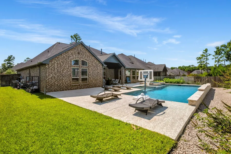 Don’t miss the opportunity to see this beautiful 1.5 story all brick home in the highly sought after gated community of Woodtrace. The covered front porch invites you into this stunning home. It has 4 bedrooms, 3.5 baths, private study, inviting family room, formal dining room and gourmet island kitchen with breakfast bar, double ovens, built-in ice maker/dry bar area, granite counter tops, hardwood flooring throughout most of the home and 3 car split garage. The luxurious primary bedroom has an ensuite bathroom with garden tub, separate shower, double vanity and large walk-in closet. If you love entertaining, the salt water heated pool/spa, large patio area, sprinkler system, landscape lighting, and meticulously landscaped lawn await. There is a decked attic space that could be made into a media room. Located minutes from FM 249 and the Woodlands, you have easy access to shopping, dinin...