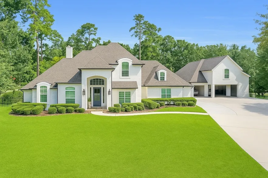 Stunning LIKE NEW custom home on 2 acres in Benders Landing, tucked on a quiet cul-de-sac with privacy and extensive updates throughout. Rare 10-car garage includes a tandem bay for RV or boat, an upstairs 20x20 office, and additional covered parking. INDOOR: Filled with custom built-ins in every room! Features include new paint Venetian plaster in the primary suite plantation shutters, new lighting and fixtures, remodeled bathrooms with new flooring, new carpet and updated appliances. The spacious kitchen opens to a bright family room with gas fireplace and views of the gorgeous backyard. Primary and guest suites are downstairs; upstairs offers 4 bedrooms with en suites and a fire escape. OUTDOOR: Extended covered patio, pool with spa and waterfall, basketball court, fire pit, accent lighting, no rear neighbors, new AC units, whole-home generator, and fully fenced yard with wrought iron fencing and automatic gate. A rare blend of luxury, space, and functionality this one has it all!