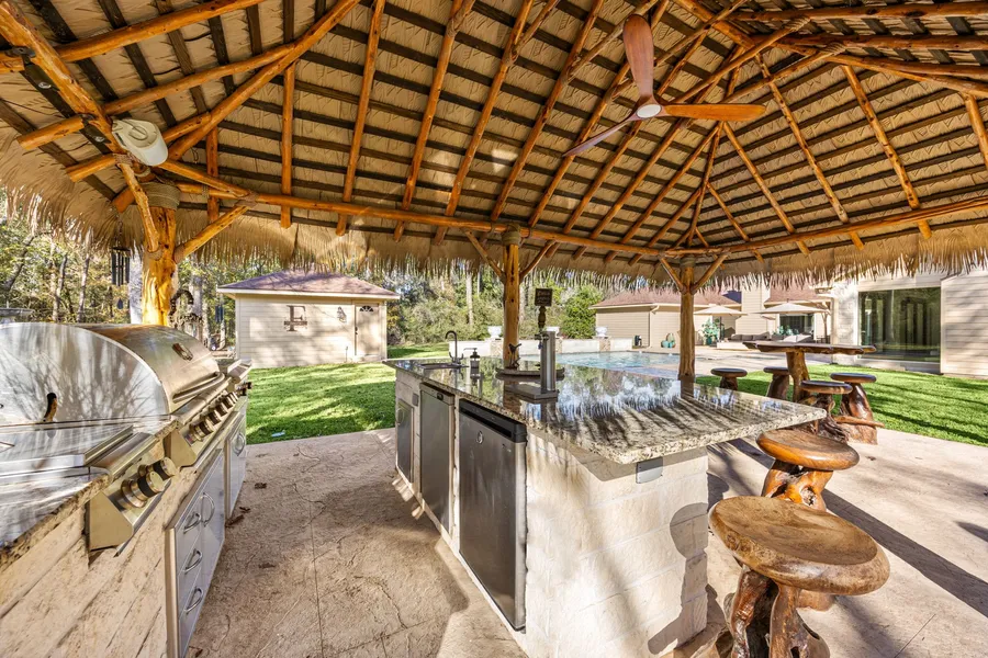 Tucked away on nearly two private acres just 10 minutes from The Woodlands, this stunning one-story retreat blends comfort with resort-style living. Enter the 180ft drive & walk into the heart of the home -- a large, open space adorned with custom Tuscan limestone fireplace, expansive views of the pool, towering trees, and breathtaking sunsets. Enjoy the air-conditioned sunroom with vaulted ceilings & Pella glass doors, a seamless balance of comfort & outdoor enjoyment. Your private oasis is ready with a new pool & spa, massive Palapa, full outdoor kitchen & bar, kegerator, and covered seating—perfect for hosting everything from quiet evenings to lively gatherings. Inside you'll enjoy a dedicated theater room with theater seating, projector/screen, acoustic panels, a spacious 16x14 walk-in closet that rivals custom luxury builds. A 33ft wide garage adds flexibility and storage! This is a legacy property where space, privacy, and unforgettable views come together. Whole home GENERATOR!