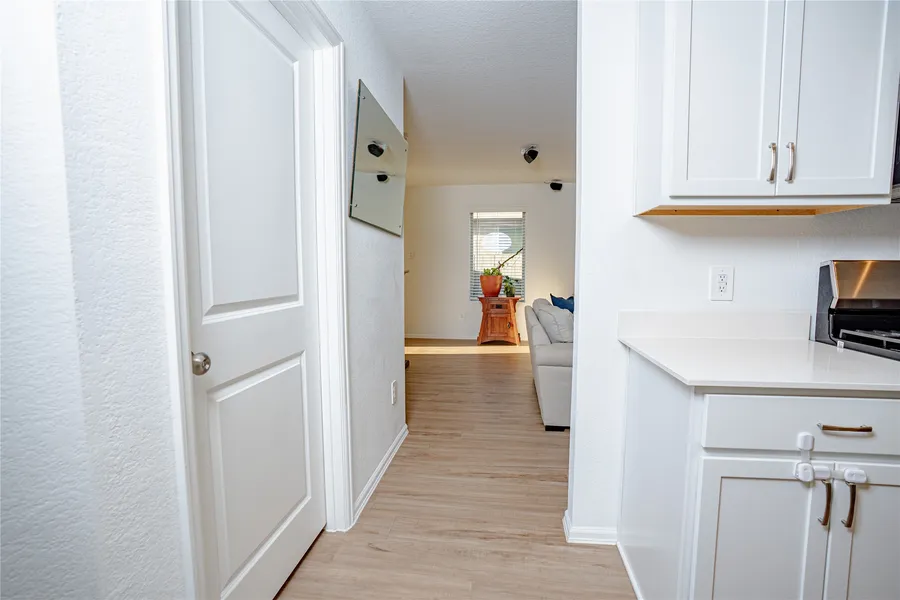 The upgraded chef’s kitchen boasts premium upgraded appliances, designer cabinet hardware, and a whisper-quiet dishwasher. Custom built-in bookshelves, closet shelving, and laundry organizer add style and function.