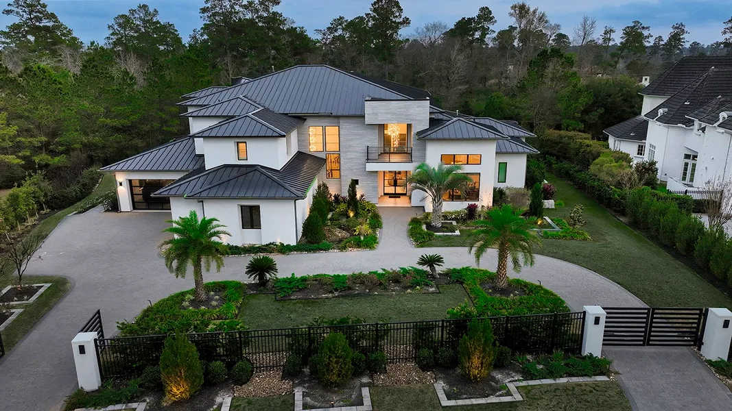 Exquisite contemporary custom built home in 24-hour guard gated Carlton Woods Nicklaus! Located on a .65-acre lot, with a gated entry, circular drive, and 4 car garage, this exceptional home is both elegant and inviting. Dual glass and iron entry doors lead you inside, where you'll notice impressive ceiling heights with decorative wood beams that add warmth and dimension, as well as stunning light fixtures. A decorative wine wall lights up to display your favorite vintages, and a media and game room downstairs means they'll get plenty of use! The sleek and functional kitchen with waterfall leathered granite island offers plenty of cabinet storage and prep space, and opens to the breakfast and family rooms, with enormous windows overlooking the private backyard. Primary bedroom suite and guest bedroom down; 3 bedrooms with en-suite baths, an enormous balcony, and a bonus room up. Resort-l...